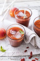 Les déposer dans le bol du blender avec le gingembre râpé puis mixer. Ajouter les baies de goji et leur jus de trempage, quelques feuilles de menthe et mixer à nouveau.