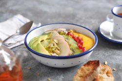 - Dresser le smoothie d’avocat dans des bols puis disposer harmonieusement les fruits coupés sur le smoothie.