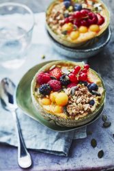 - Verser le smoothie melon abricot pêche dans les coques de melon. Garnir le smoothie de fruits rouges et de muesli, de graines de courges et de pistaches, et ajouter les billes de melon en finition.