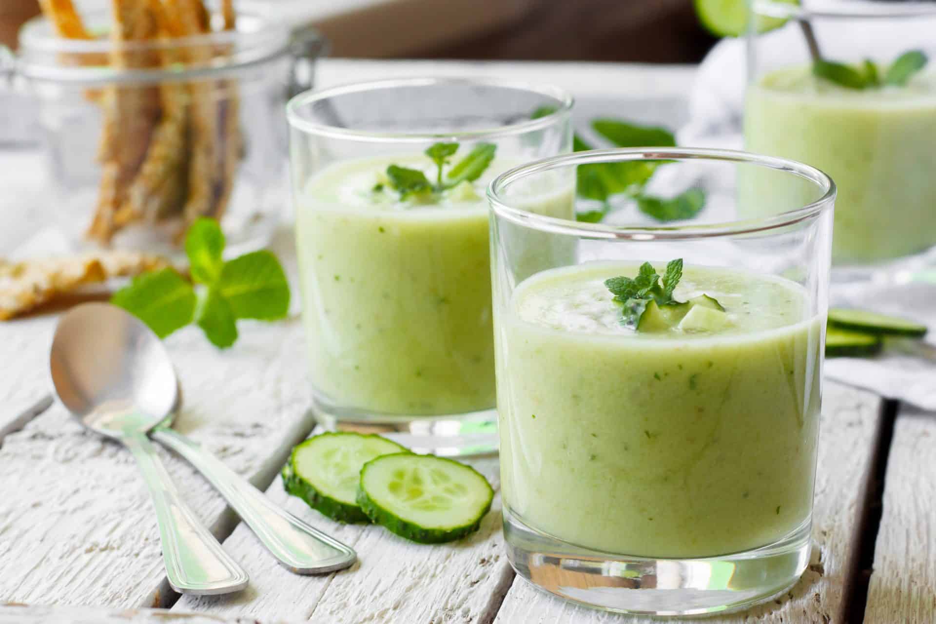 - Déposer les dés de concombre et d'oignon dans le bol du blender (ou mixeur). Ajouter l'huile d'olive, la ciboulette grossièrement ciselée et les glaçons. Mixer.