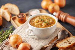 Pour une soupe à l’oignon gratinée, versez-la dans des bols après 10 min de cuisson. Recouvrez de croûtons et d’une généreuse couche de gruyère râpé, puis mettez au grill pendant 10 min.