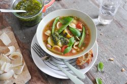 - Au moment de servir, faire réchauffer la soupe à feu doux et ajouter les pâtes pour les faire cuire (8 à 12 min selon le type de pâtes choisi). Servir le pistou séparément. Chaque convive en parfumera sa soupe à sa guise.