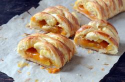 - Disposer un boudin de préparation aux abricots sur la longueur de la pâte, à environ 2-3 cm du bord.