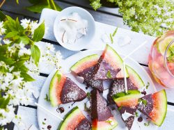 - Faire fondre le chocolat au bain-marie ou au micro-onde (2 x 1 min en remuant à la cuillère entre les deux session de chauffe). Tremper la pointe de chaque triangle de pastèque dans le chocolat puis les placer sur un papier cuisson. Saupoudrer de fleur de sel, de noix de coco râpée et de menthe ciselée.