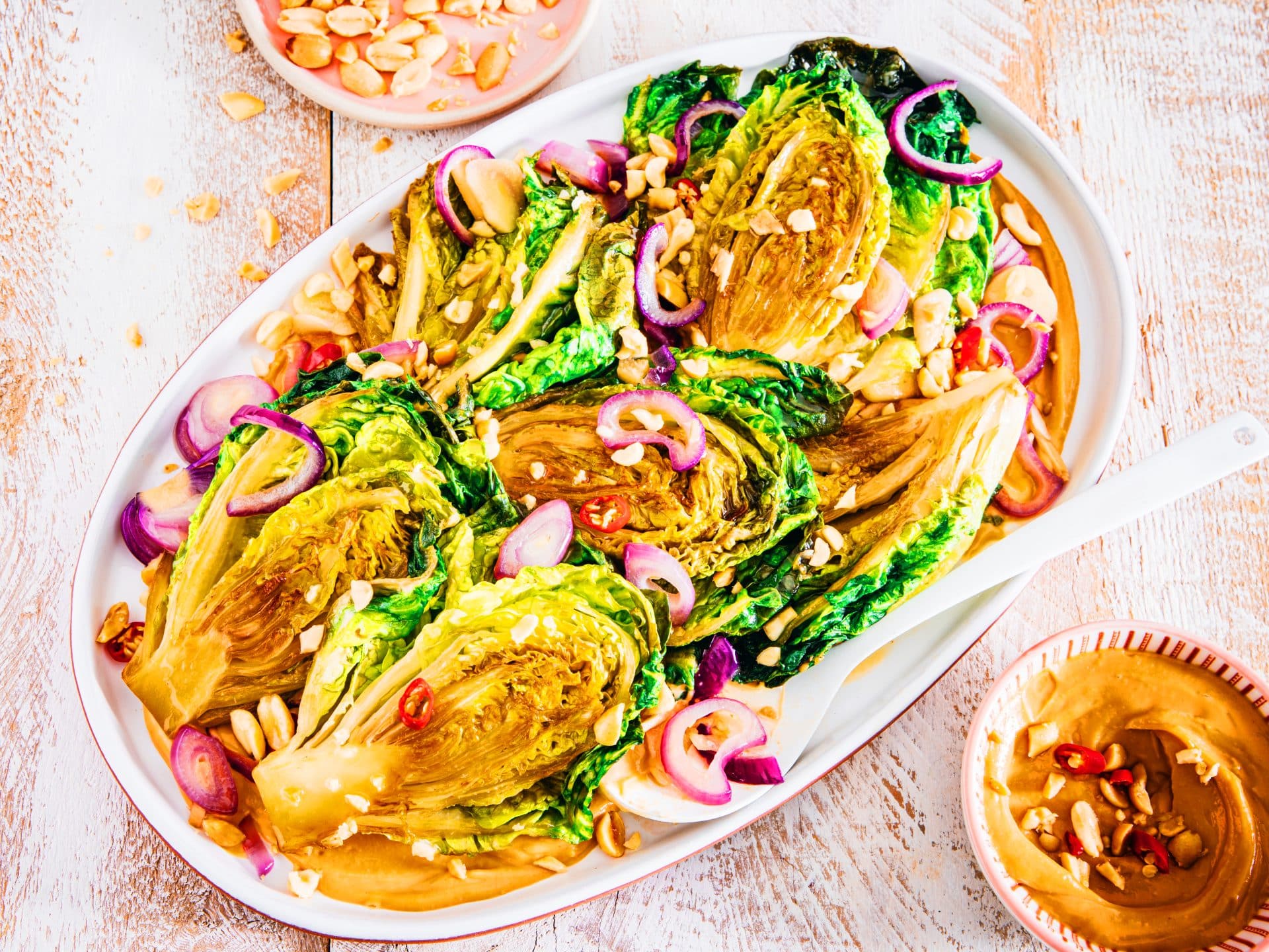 - Étalez les 2/3 de la sauce dans un plat, versez les sucrines par-dessus, parsemez de cacahuètes et servez avec le reste de sauce à côté.