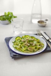 - Pendant ce temps, laver les courgettes et les émincer en rubans (à la mandoline ou au rasoir à légumes). Jeter les courgettes dans la sauteuse. Cuire encore 3 à 5 min en remuant de temps à autres.