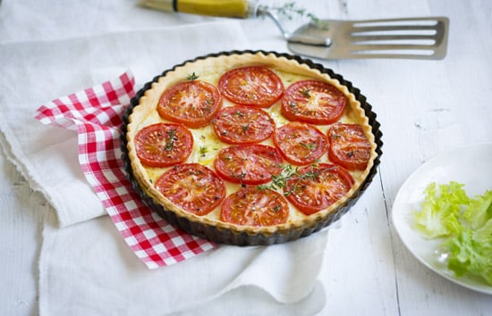 - Couper les tomates en tranches épaisses (environ 1,5 cm). Les répartir harmonieusement sur le fond de tarte. Les saler légèrement.