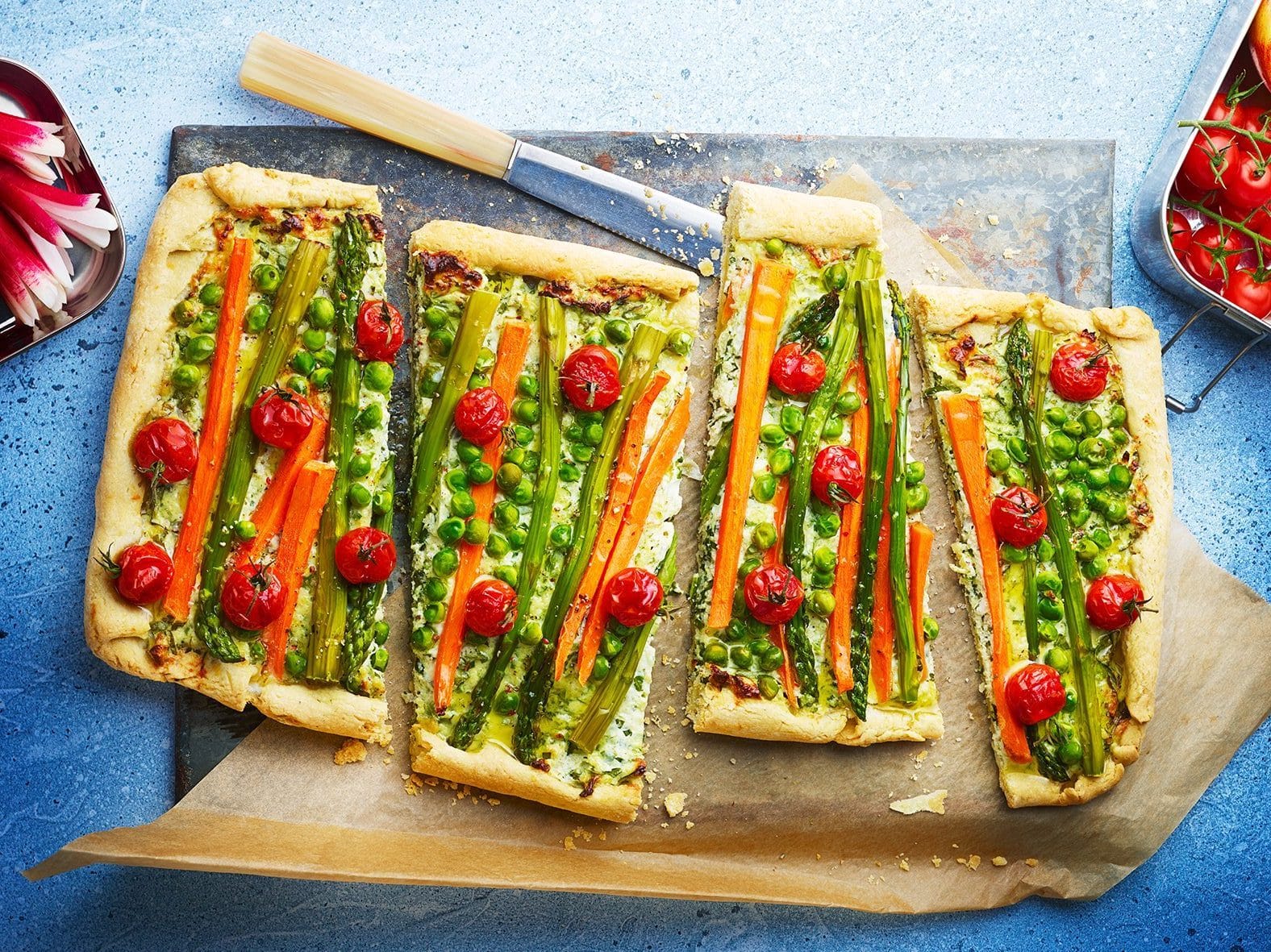 Étaler la préparation à la ricotta sur la pâte en laissant 3 cm de bord vide. Aligner les asperges et les bâtonnets de carotte sur la ricotta, ajouter les petits pois et les tomates cerises puis rabattre les bords de pâte.