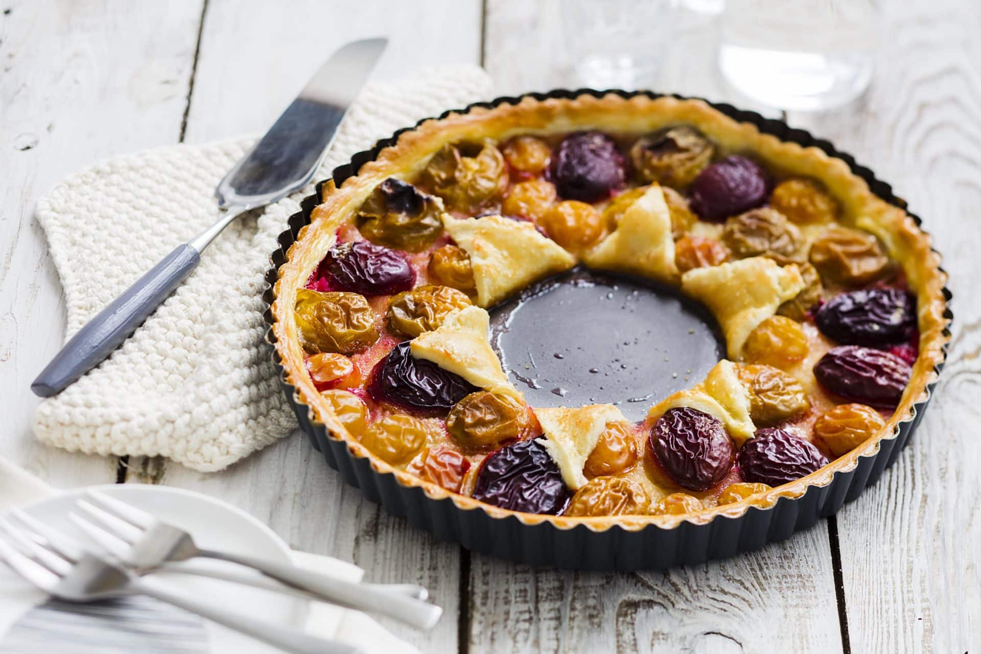 - Saupoudrer de poudre d’amande et placer les demi-prunes sur le fond de la tarte. Retirer le bol et découper la pâte restée sans fruits en étoile (en partant du centre) de sorte à pouvoir rabattre les pointes sur les prunes.