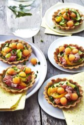 - Déposer des lanières de poivrons et des courgettes marinées sur les fonds de tarte. Ajouter quelques billes de melon et des lanières de jambon sec.