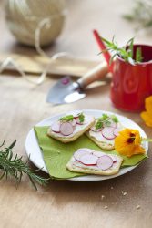 - Dispose harmonieusement les rondelles de radis sur les biscuits.