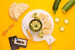 - Découper le pain pita ou naan en petits triangles et les faire légèrement griller.