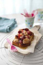 - Nappe les tartines de sirop d'érable et parsème les fruits d'amandes effilées.