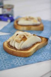 Coupe les tartines en 4 (en triangle ou en carré) puis parsème d’amandes effilées grillées.