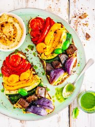 Faites griller les tranches de pain, tartinez-les de houmous puis répartissez les légumes rôtis. Ajoutez des feuilles de basilic et un tour de moulin à poivre et servez sans attendre.