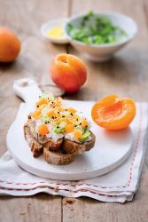 Tartine gourmande au chèvre frais, fèves et abricots de nos régions