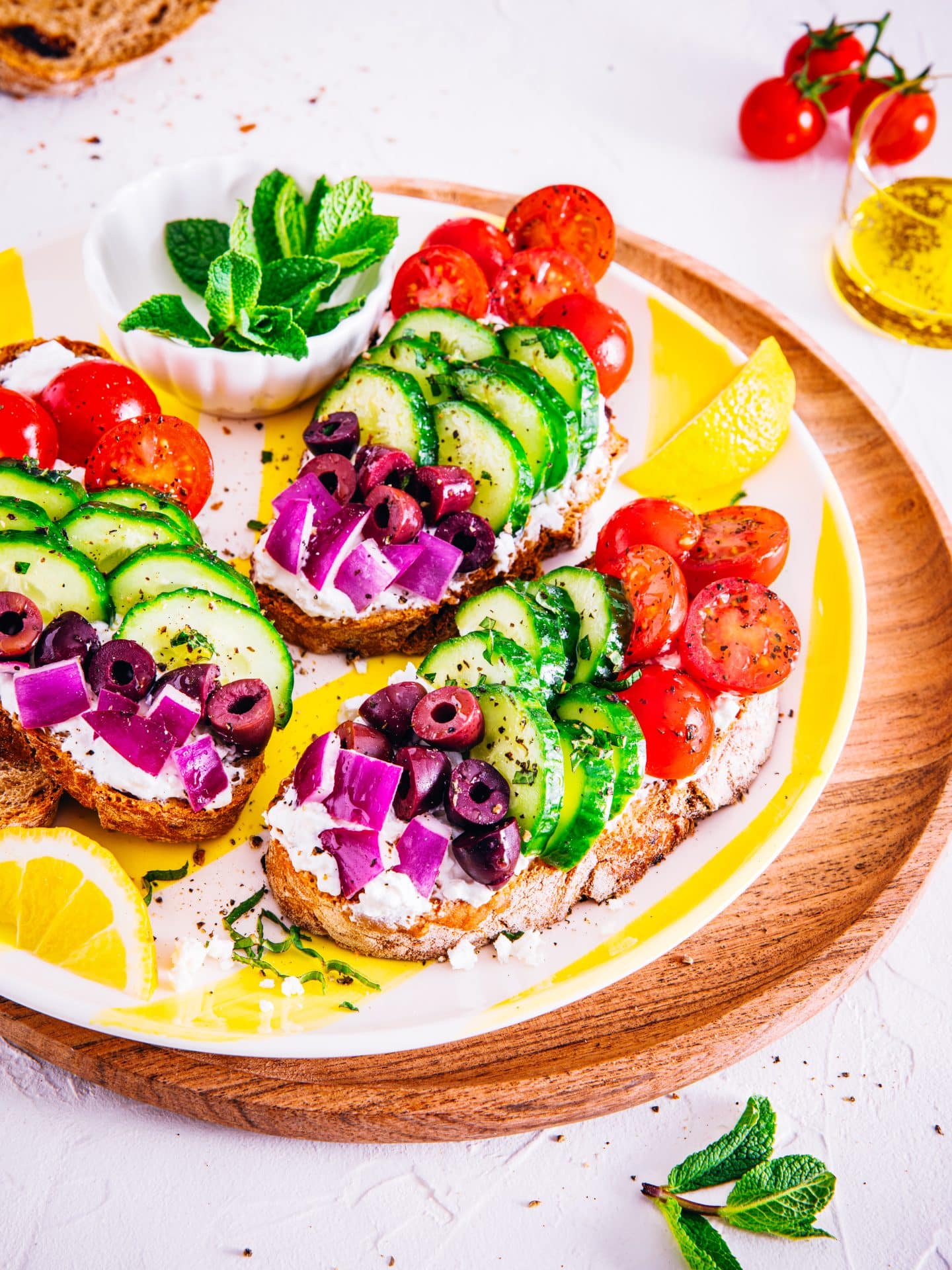 - Écrasez à la fourchette la feta avec le yaourt, poivrez. Tartinez ce mélange sur les tranches de pain, puis disposez les légumes et les olives coupées en deux, en rangeant les légumes par couleur pour un effet « arc-en-ciel ». Salez, poivrez et servez sans attendre.