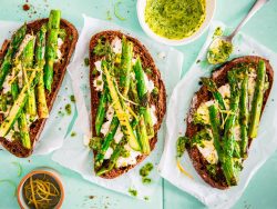 - Faites griller les tranches de pain, recouvrez-les de préparation à la mozzarella, répartissez les asperges et arrosez de sauce verte.