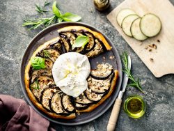 Tatin d’aubergines, burrata, pignons de pin