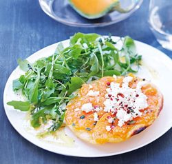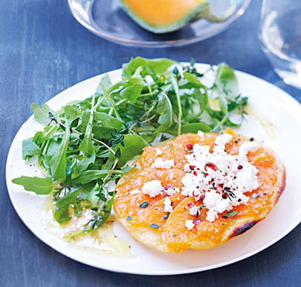 - Mettre une poêle à chauffer, faire fondre le beurre, faire dorer les tranches de melon de chaque côté 5 min à feu doux. Ôter le jus et réserver sur une assiette.
