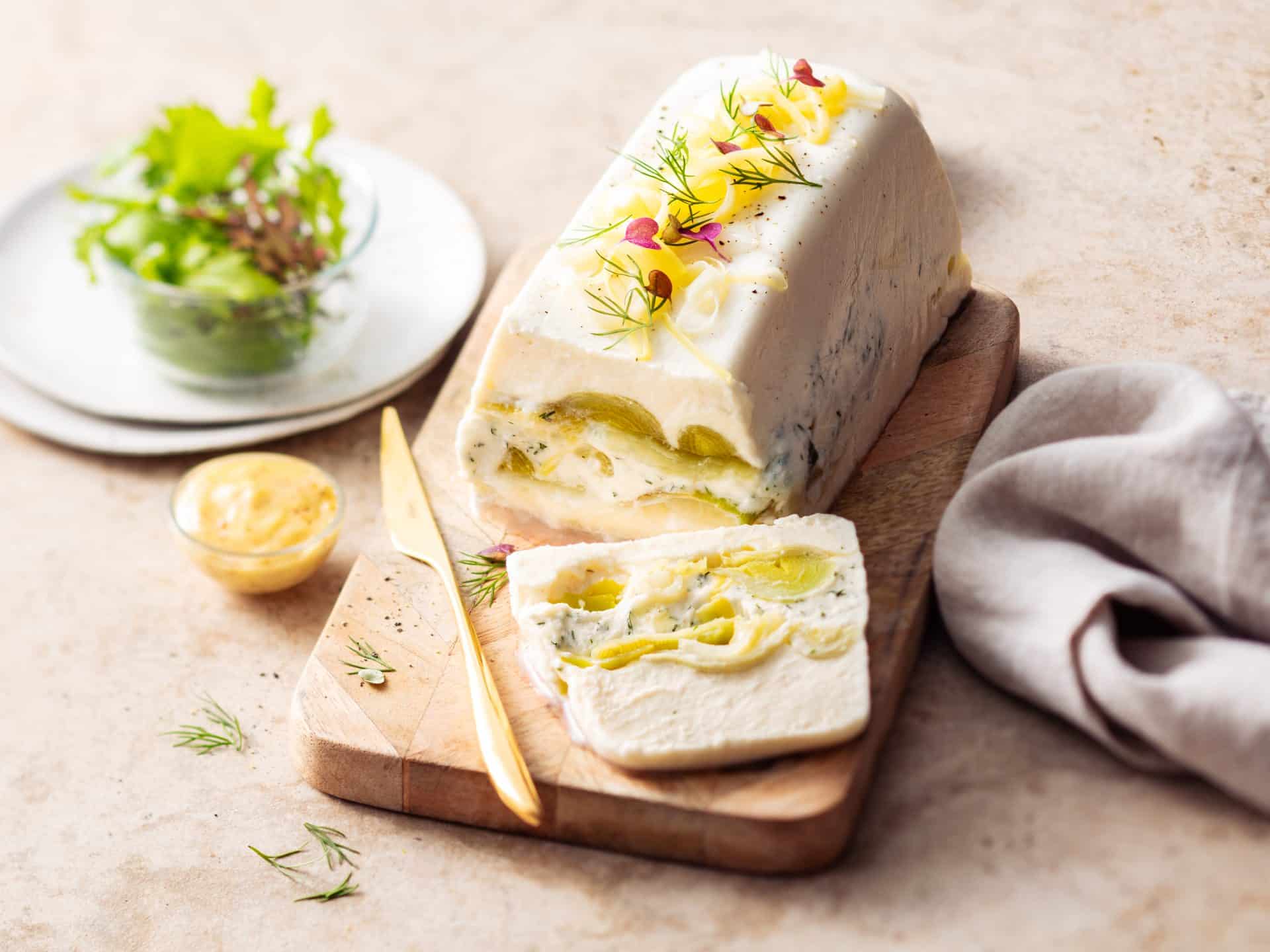- Procéder au montage en alternant une couche de mélange chou-fleur/chèvre et lamelles de poireaux.
