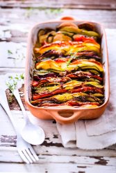 Tian de pommes de terre, tomates, courgettes et oignons rouges