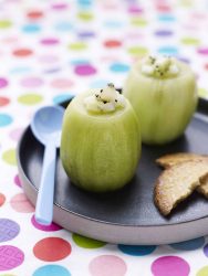 - Coupe chaque extrémité des kiwis pour qu’ils ressemblent à des petits tonneaux. Pèle-les à l’économe. Creuse-les à la cuillère en faisant attention à garder la forme du fruit. Taille la chair du kiwi que tu as enlevé en petits dés.