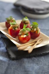 - Garnir les tomates cocktail évidées en commençant par les légumes aux herbes. Couvrir ensuite d'écume à la mozzarella. Servir frais.