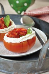 - Décalotter les tomates au tiers. Les évider puis les garnir avec les fraises.