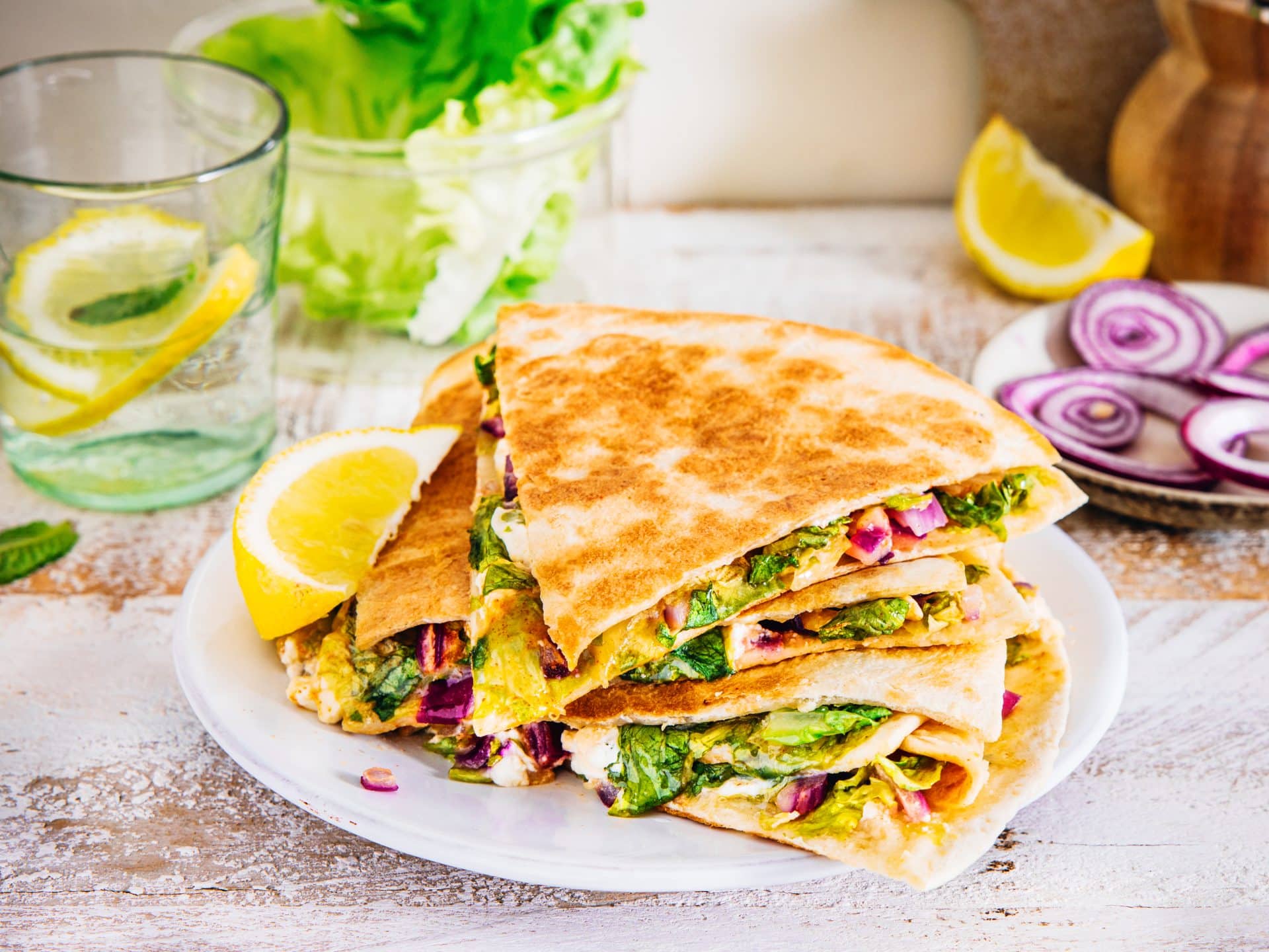 - Faites chauffer à feu moyen une poêle avec un filet d’huile d’olive. Disposez une tortilla, recouvrez-la d’environ 1 cm de garniture et ajoutez une seconde tortilla par-dessus. Laissez cuire 3-4 min en appuyant régulièrement dessus à l’aide d’une spatule. Retournez l’ensemble et faites cuire l’autre côté encore 3-4 min.