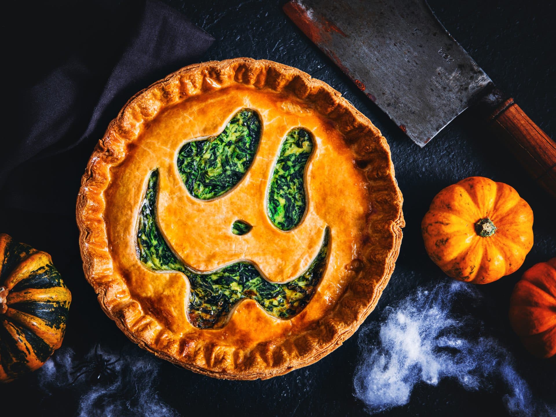 Préchauffez le four à 200°C. Versez la farce aux épinards dans le moule, disposez le disque de pâte décoré sur le dessus, coupez l’excédent de pâte et soudez bien les bords des deux pâtes ensemble.