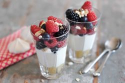 - Répartir la préparation dans les verrines puis ajouter les fruits rouges mélangés. Parsemer de muesli avant de servir.
