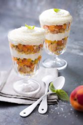 - Dans chaque verrine, déposer un peu de biscuits émiettés. Ajouter une couche de fruits et un nuage de chantilly au basilic. Répéter l’opération une seconde fois et terminer par quelques miettes de biscuits. Décorer d’une feuille de basilic juste avant de servir bien frais.
