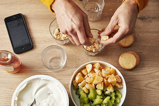 - Déposer deux cuillères à soupe de fromage blanc et un filet de miel dans chaque verrine et terminer par une couche de fruits.