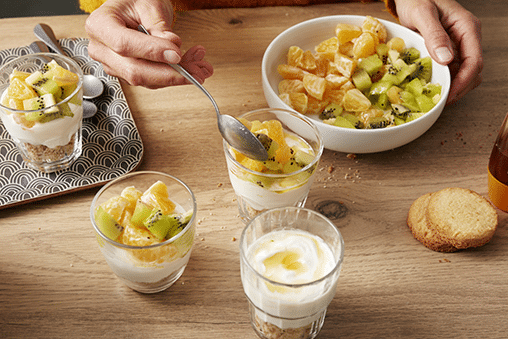 Trifle de kiwi, clémentine au fromage blanc et palet breton