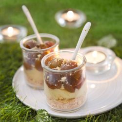 - Dans des verrines, répartir les amarettis concassés, la crème pâtissière puis les mirabelles.