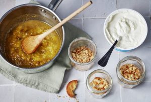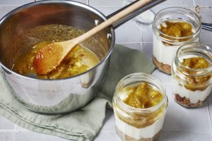 - Monter les verrines en commençant par les palets bretons, le fromage blanc et terminer par la compotée de prunes. Ajouter quelques morceaux de prunes pour décorer.