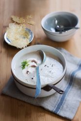 - Agrémenter le velouté de crème fraîche. Parsemer de cerfeuil ciselé et déposer une tuile de parmesan juste avant de servir.
