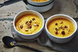 Customisez ce velouté exotique selon votre goût en ajoutant dans les assiettes ou les bols de service : de la coriandre fraîche ciselée, des zestes d’orange, des amandes effilées grillées, du gingembre frais râpé, des crevettes grillées, des dés de mangue, de la cive ciselée, du piment, etc.