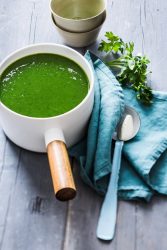 Laver le persil puis le ciseler grossièrement. Dans une grande casserole, déposer le beurre et faire « tomber » le persil (c’est-à-dire, le faire réduire en volume en remuant de temps en temps).