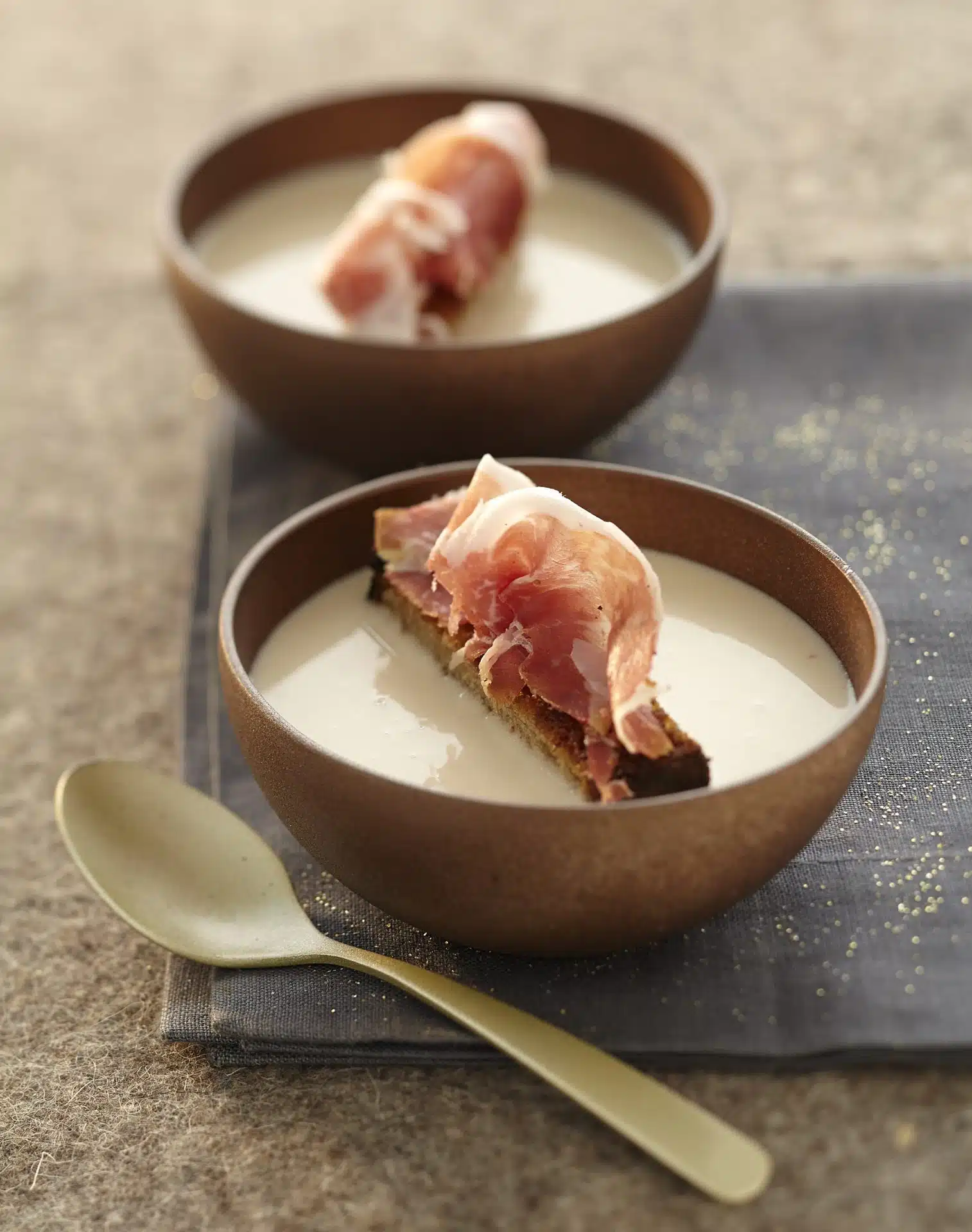 Une fois les topinambours cuits, déposez-les dans la cuve d’un mixeur avec la crème liquide. Mixez et ajoutez la quantité de bouillon de jambon suffisante pour obtenir un velouté onctueux.