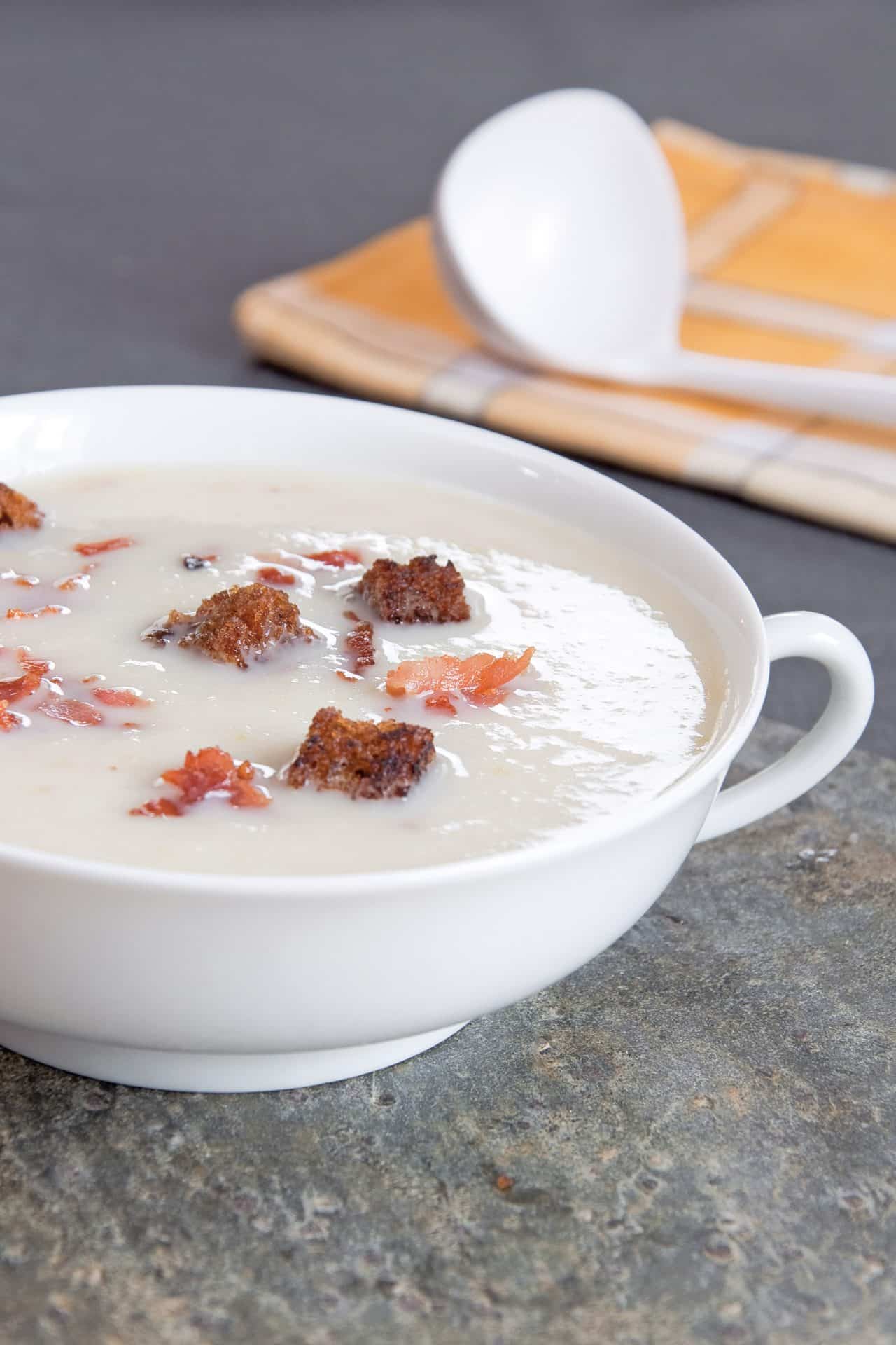 Servir bien chaud parsemé du mélange bacon-pain d'épices.