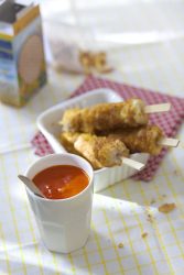 - Passer les dés de poisson successivement dans la farine, dans l’œuf puis dans les corn flakes écrasés. Les faire dorer à la poêle dans un fond d’huile d’olive.