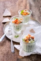 - Répartir la crème de concombre râpé dans les verrines, ajouter les fruits de mer marinés et parsemer de feuilles de cerfeuil. Servir bien frais !