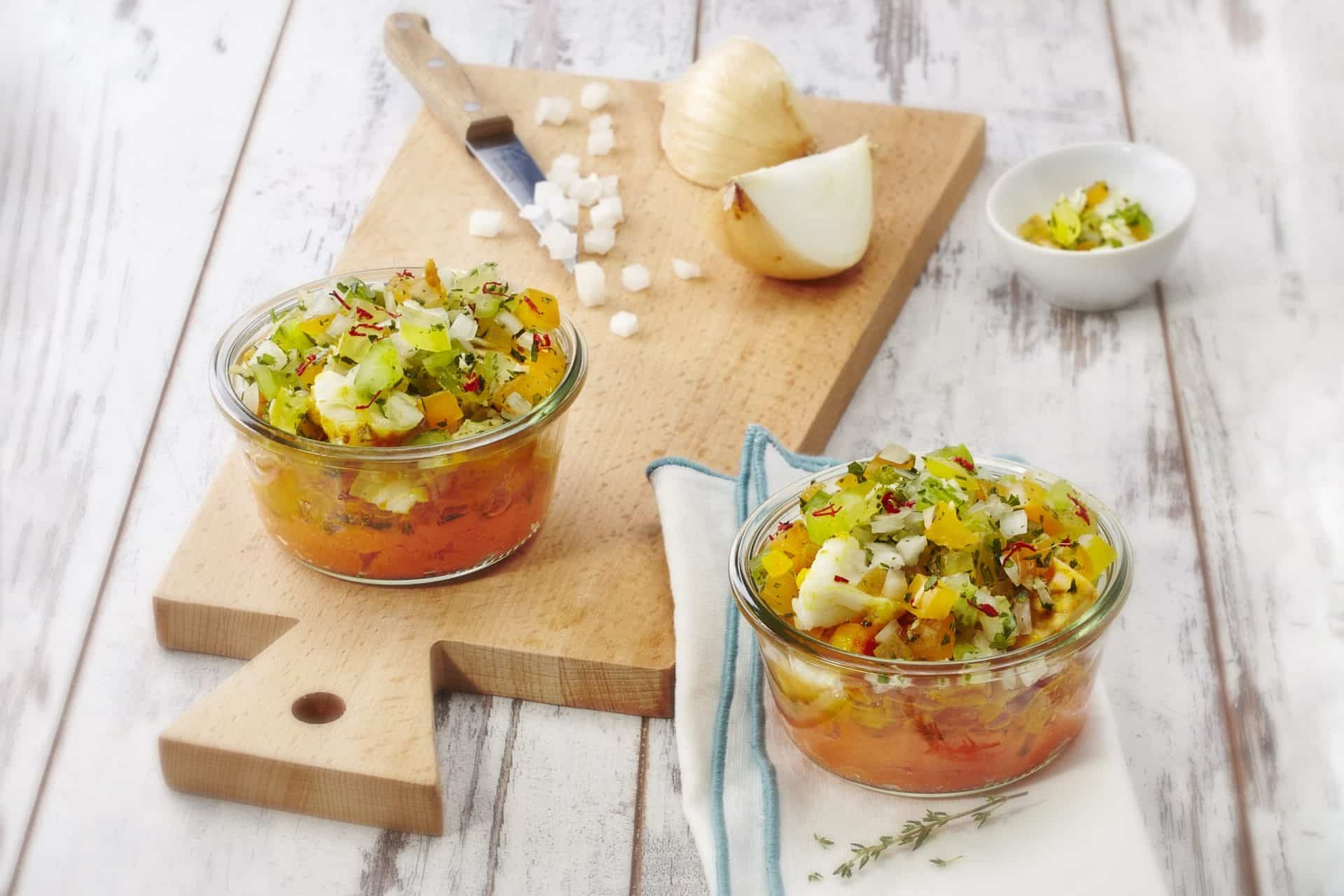 - Réchauffer la purée et la déposer dans chaque verrine, répartir le poisson et napper de rougail. Servir aussitôt.