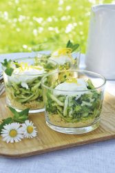 - Dans un bol, déposer les petits suisses. Saler puis incorporer les zestes de citron. Répartir les biscuits écrasés dans des verrines puis répartir dessus la salade aux herbes et terminer par une cuillerée de petit suisse aux zestes de citron.