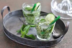 - Répartir le sirop de sucre de canne dans les verres, ajouter les feuilles de menthe froissées, les quartiers de citron, le concombre râpé, les glaçons et terminer par l’eau gazeuse.