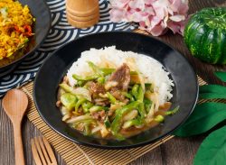 - Servir aussitôt avec du riz blanc et/ou de petits légumes vapeur.
