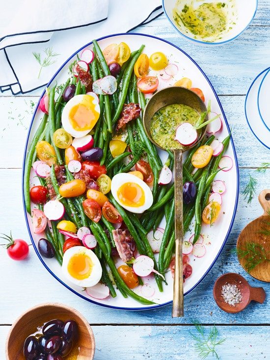 Equeuter et rincer les haricots verts. Les plonger dans un volume d'eau bouillante salée pendant 12 à 15 min. Les passer sous l'eau froide pour stopper la cuisson. Réserver.