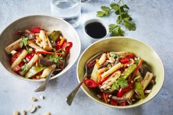 Wok de scorsonères au bœuf, coriandre, carotte, pois gourmand, poivron